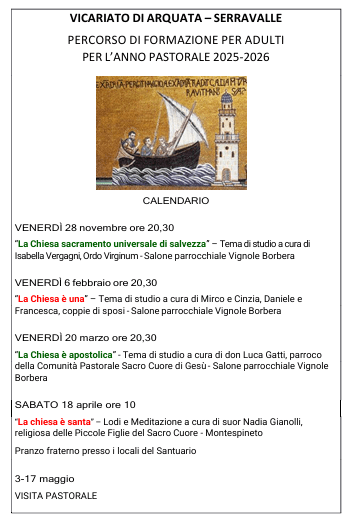 | CATECHESI VICARIATO: sabato 18 aprile, ore 10, a Montespineto “La Chiesa Santa”. Relatrice Sr Nadia Gianolli. Possibilità di fermarsi per il pranzo previa prenotazione in parrocchia. |